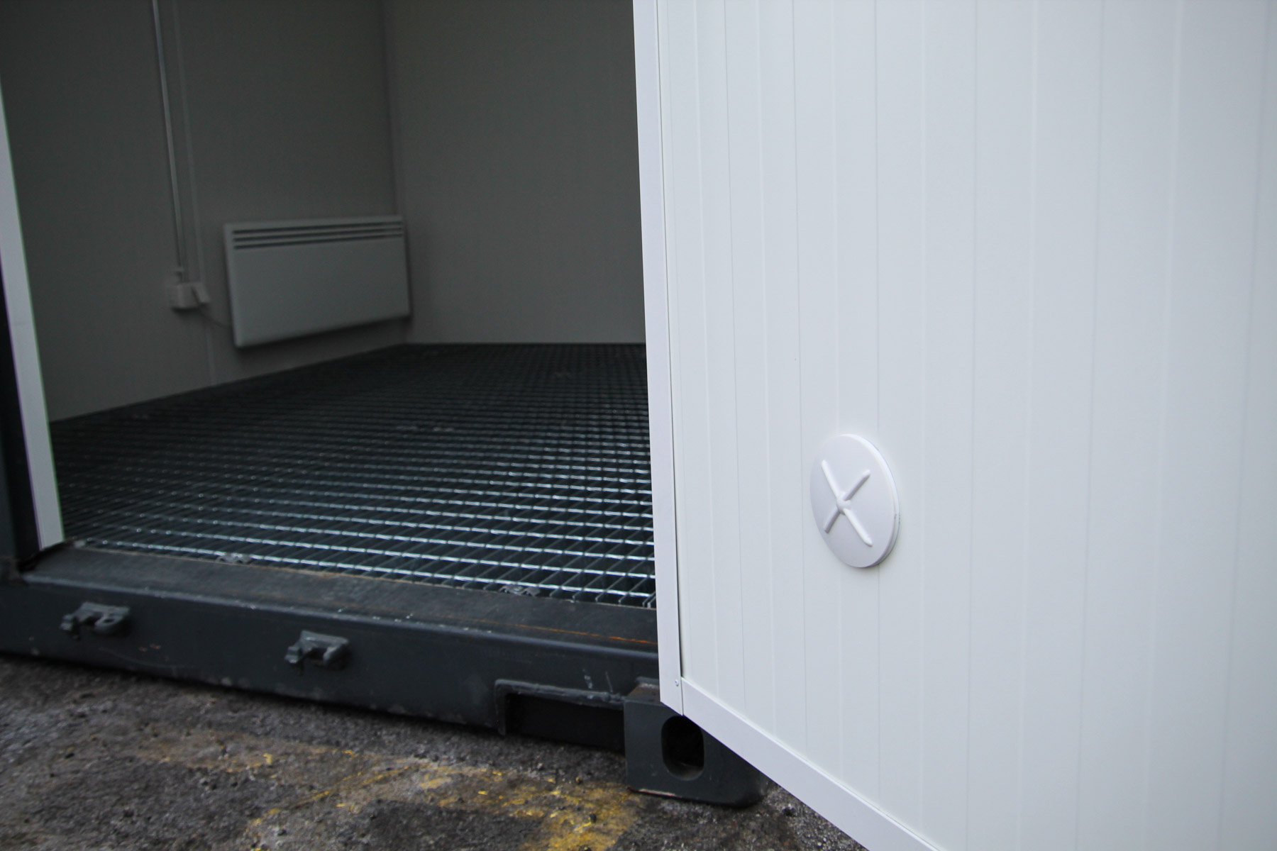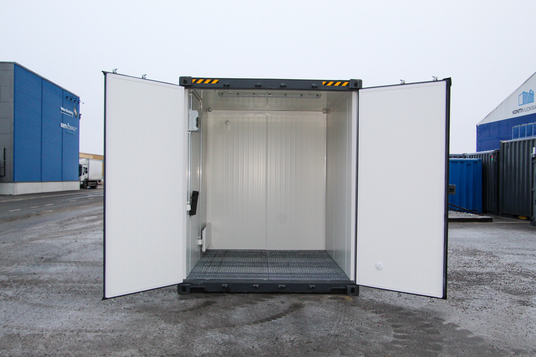 - PIR-värmeisolering: Väggarna, taket och dörrarna är isolerade med PIR-sandwichelement. Invändiga ytor är tillverkade av vit plåt
